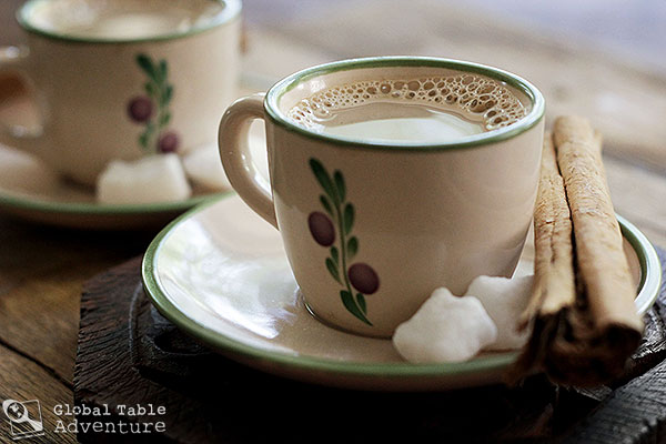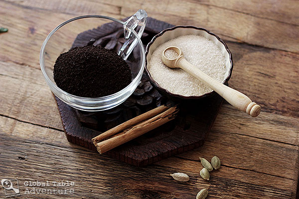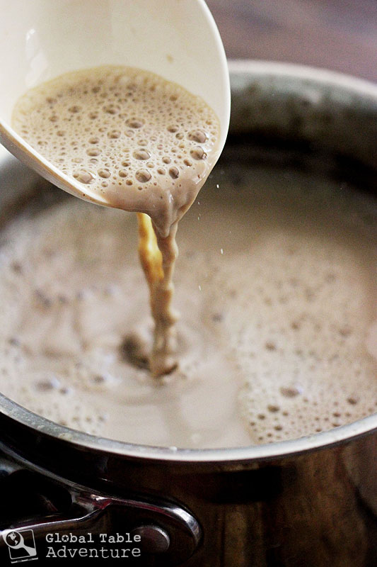 … dark roast coffee, a cinnamon stick, milk, and some water. You can add the sugar now, too (that’s what I did), or you can let your guests add their own.