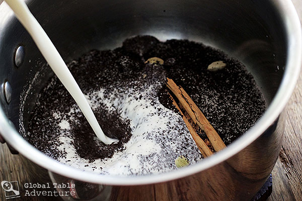 - Crack open a few cardamom pods and toss them in a large pot, along with dark roast coffee, a cinnamon stick, milk, and some water. You can add the sugar now, too (that’s what I did), or you can let your guests add their own.