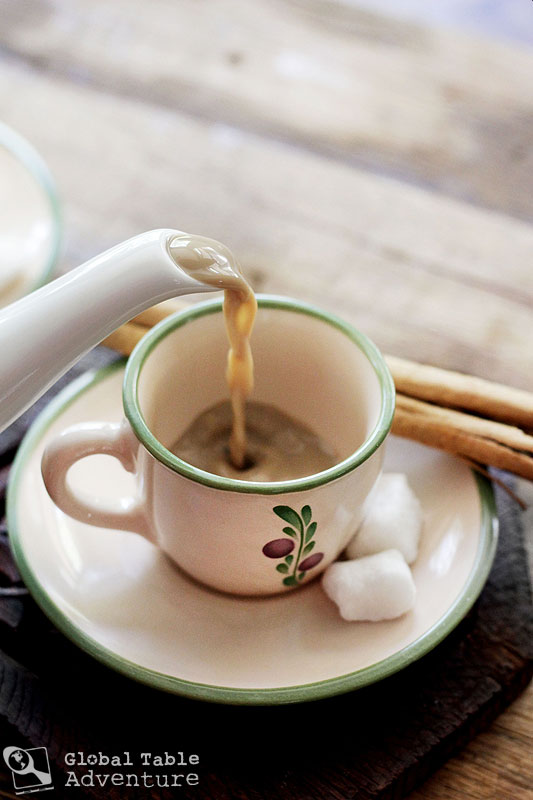 - Simmer for ten minutes. Ladle the liquid as it bubbles and bobs, pouring from up high to aerate the coffee mixture. Do this about twenty times. Strain the milky mixture and transfer to a pretty coffee pot. Pour into cups and serve with a cinnamon stick (to amp up the cute factor).