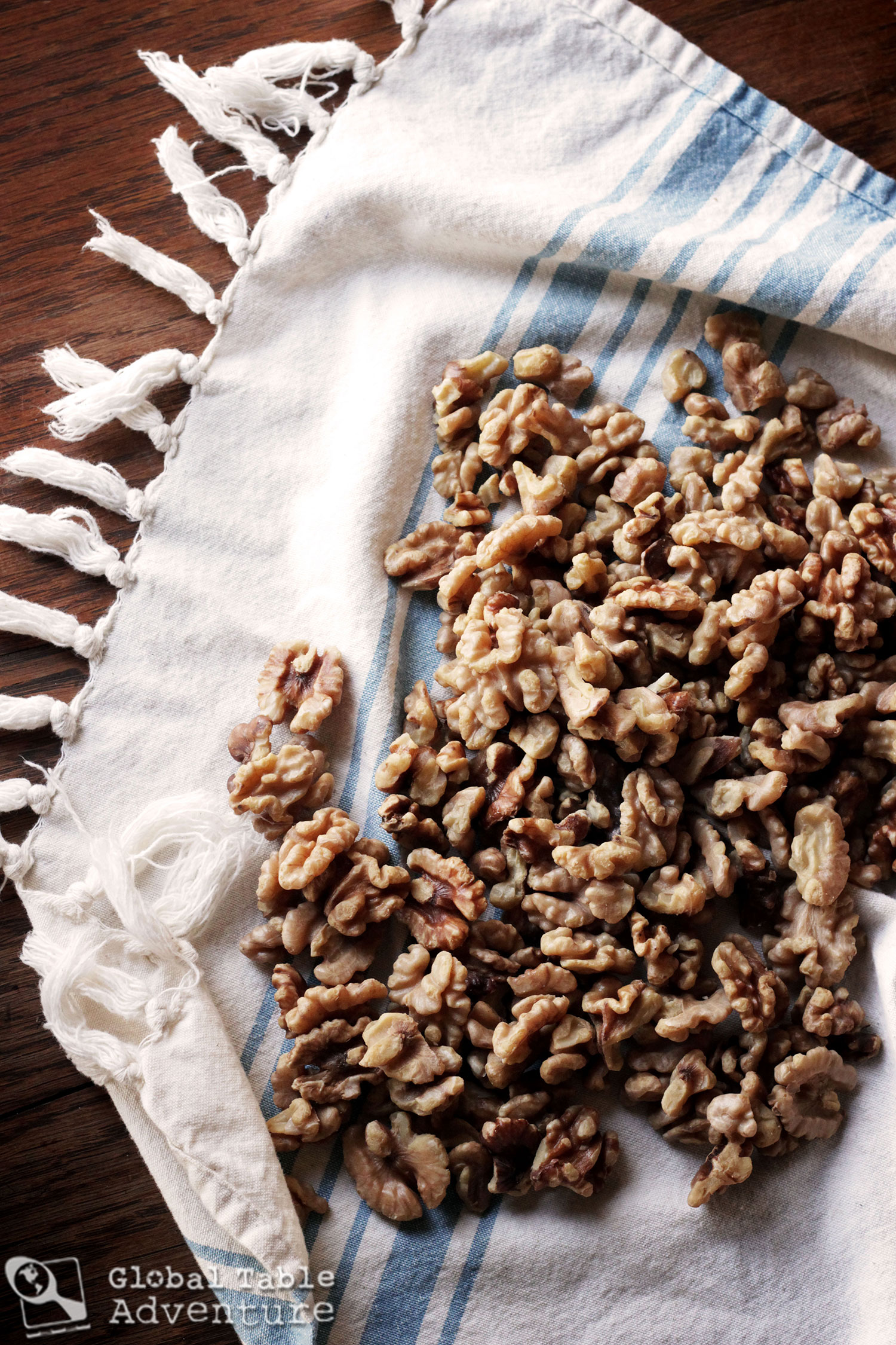 Dry well with towels. Toss completely with sugar on a cookie sheet and let dry in a warm sunny spot for about 2 1/2 hours. The sugar will cling to the seemingly dry walnuts since there will be traces of moisture. You may want to turn once or twice early on to make sure they’re coated well. The walnut and sugar mixture is done drying when the sugar hardens into a crust around the walnuts (it’ll be hard to the touch).