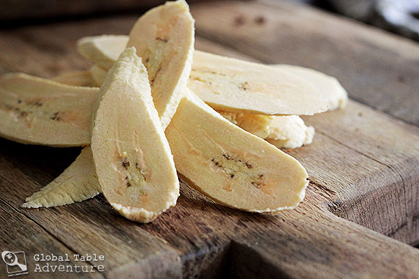 This is nothing like a sweet banana (looks can be deceiving). This is her savory cousin - full of good fiber and lots of potassium. I like to remind myself of that, as I reach for my second and third helpings.