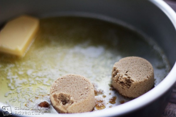 Place your cake pan over low heat on the stovetop. Add the remaining 4 tablespoons of butter and the brown sugar. Once melted, stir to make an even coating on the bottom of the pan and remove from heat.