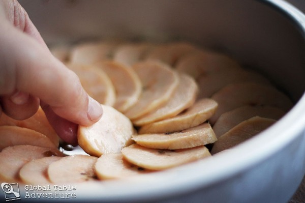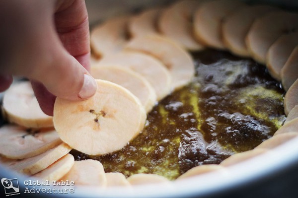 Now the fun part! Layer the sliced plantains around in overlapping circles. I could get about 2 circles in my 8″ cake pan, plus a final circle in the center.Beautiful!