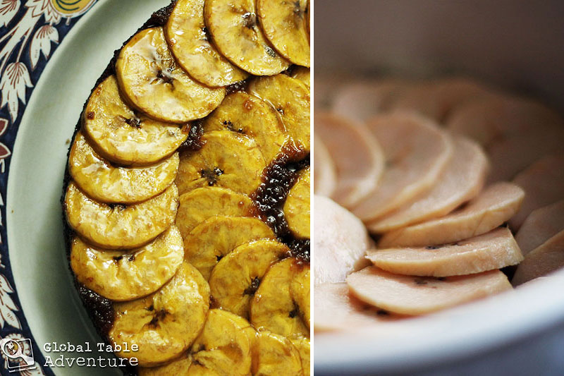 5. Layer the sliced plantains around in overlapping circles.