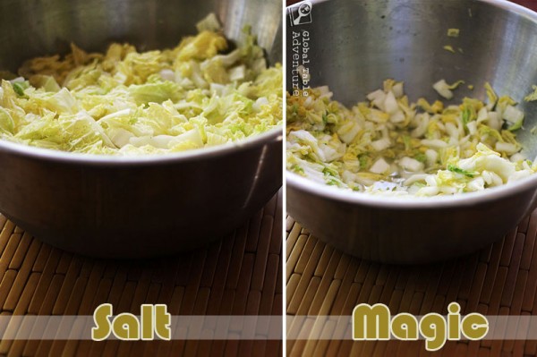 2. Cut away the tough core and chop the cabbage into bite sized pieces. Place in large bowl. sprinkle with salt and let sit 2-3 hours, tossing once in a while.