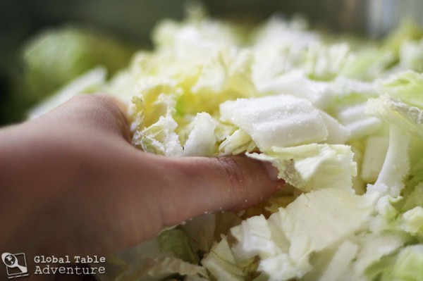 Cut away the tough core and chop the cabbage into bite sized pieces. Place in large bowl. sprinkle with salt and let sit 2-3 hours, tossing once in a while.