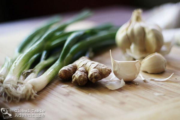Meanwhile, grate the ginger and garlic and cut the green onion into large pieces.