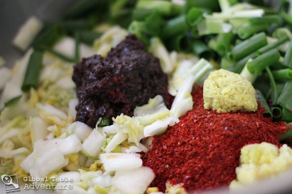 3. Meanwhile, grate the ginger and garlic and cut the green onion into large pieces. Measure out the hot pepper and shrimp paste. You could easily double the hot pepper for a fiery hot kimchi. Our version is a medium heat.