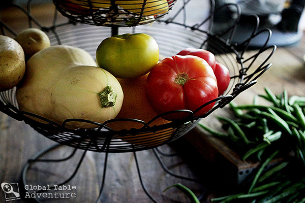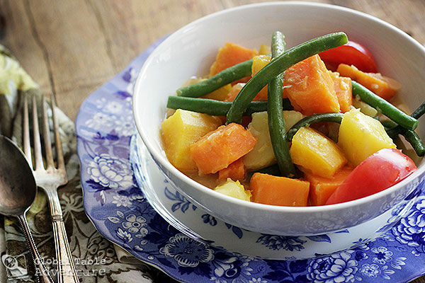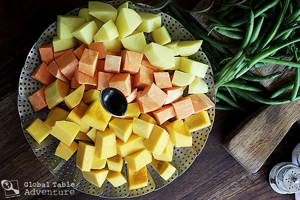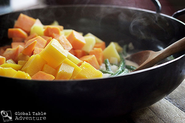 Inspired by the back to school season, I chose an assortment of autumnal veggies for our curry, although any veggies will do (think eggplant, zucchini, yucca, and taro). According to Jill, who lives in Papua New Guinea: