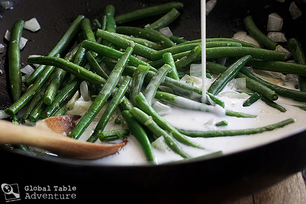- Add in trimmed green beans and creamy coconut milk. Bring to a gentle bubble.