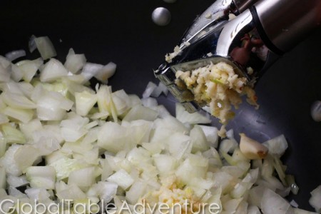 - Heat over medium heat. Add onion and garlic and cook until onion is soft and turning slightly golden.
