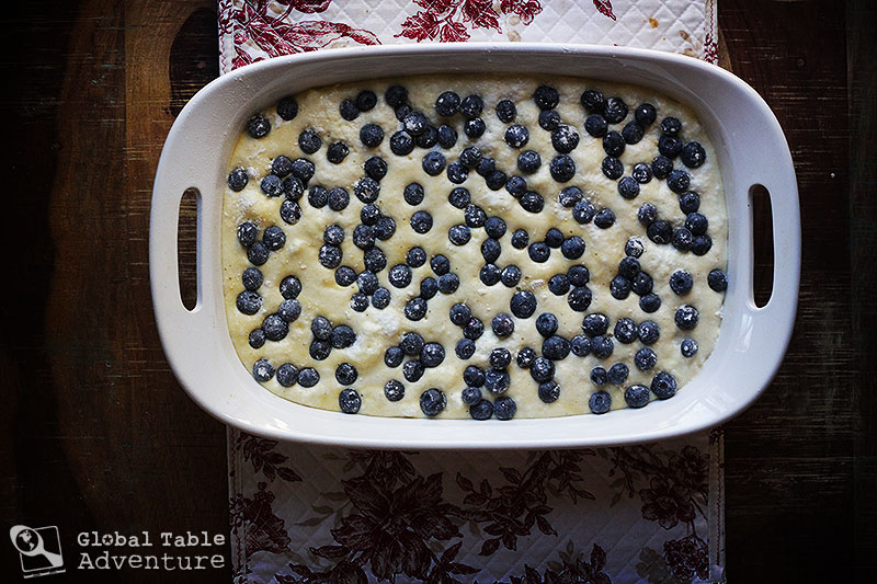 Pour this voluptuous batter into your baking dish and cover randomly with fruit. Be gentle, so as to not overly deflate the cake. Some fruit will sink immediately and that’s okay. In this photo, I only needed 1 3/4 cups fruit.