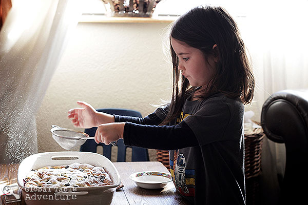 Once out of the oven, the whole thing is covered with a cloud of powdered sugar, until even the air around it tastes sweet.