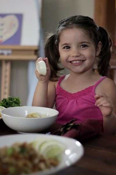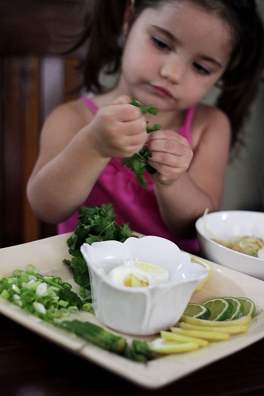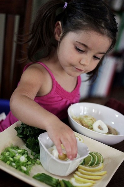 You can call it Coconut Chicken Noodle Soup, if you’d like. To a local, this curry topped with egg and a garden of garnishes is breakfast, lunch, or dinner. It’s as easy to find in rambling shacks as it is in roadside stalls. I can’t get over how easy it is to make. Chop a few things, toss them in a pot and simmer. After a happy mingle serve with noodles and enough garnishes to bring out even the Grinch’s smile, not to mention little Miss Ava (have I told you lately how much kids like to help build their own meals?).
