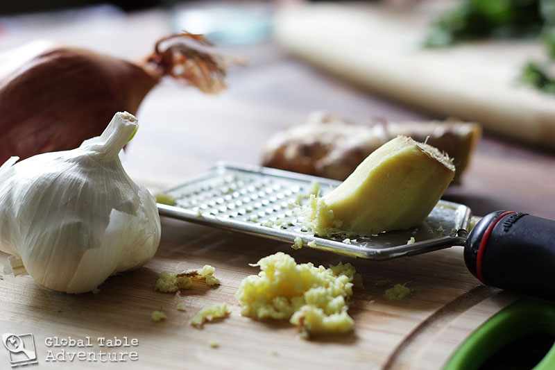 Meanwhile, grate the ginger, garlic and slice the onion. Whistle a little, if you can.