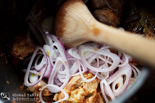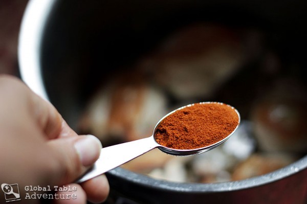 2. Once the chicken is brown on both sides, sprinkle on the paprika, ginger, and garlic. Cook for a minute, until fragrant. Then add the beautiful shallot and cook a few minutes to soften. The shallot will add sweet goodness to the curry and balances the heat from the hot paprika.