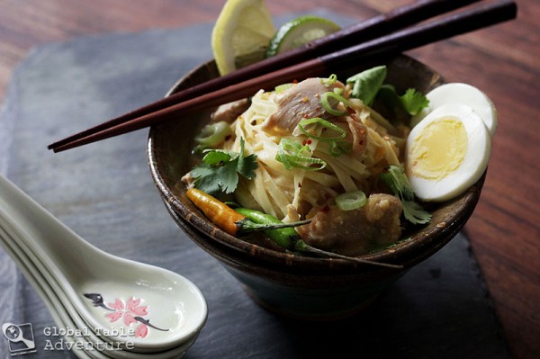 The secret to making a great ohn-no-khao-swe is in the toppings. More specifically, in assembling your own bowl, just as you like it. If you do it right, in every bite you’ll find chicken, noodles, chili peppers, green onion, cilantro, eggs, lime juice, and fish sauce.