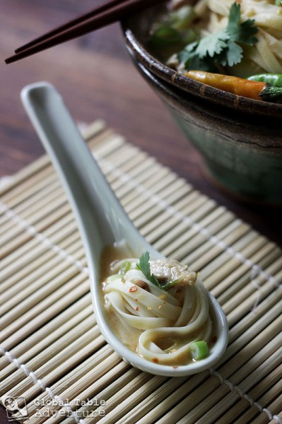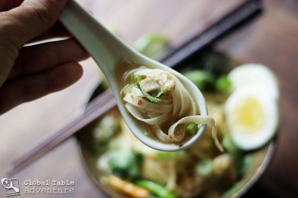 The secret to making a great ohn-no-khao-swe is in the toppings. More specifically, in assembling your own bowl, just as you like it. If you do it right, in every bite you’ll find chicken, noodles, chili peppers, green onion, cilantro, eggs, lime juice, and fish sauce.