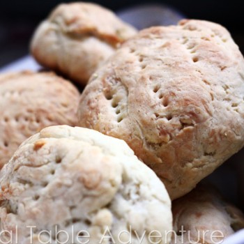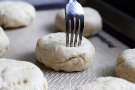 Knead it as smooth as you can. I didn’t do a great job at this, so my biscuits are a bit shaggy looking. Spend some time on this step and you can have really pretty rolls. Let rise another 30 minutes after shaping and prick with a fork. Preheat oven to 375F.