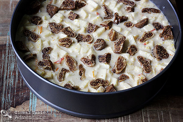 - Finally, stir in 8 oz of chopped figs, the apples, orange and lemon zests. Combine well. Pour into prepared pan, then top with fig pieces, being careful not to push them into the batter.