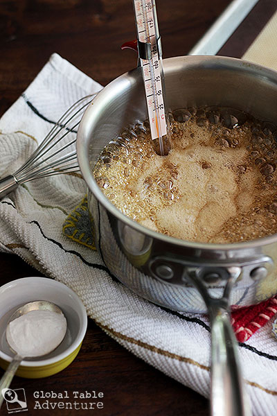 - First step – prepare a lined baking sheet that will be quick and easy to reach from your stovetop. Like lightening quick. Then mix the honey and sugar together in a fairly large pot (you’ll see why in a moment). Add the candy thermometer and heat over medium high for about five minutes or until 300F (a.k.a. hardball candy stage) and when a little is dropped into ice water off a spoon, it forms a hard ball. I highly recommend doing the ice water test even if the thermometer reads 300F because you might have it sitting in a hot spot (or a cold spot). I had to cook mine a little longer than my thermometer suggested because of this. If it doesn't get to hard ball, the candy won’t harden properly and will come close to pulling your teeth out.