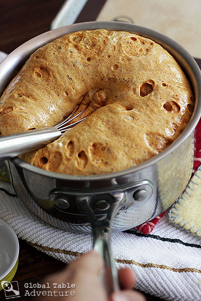Now, remove the thermometer and whisk in the baking soda. Quickly.
