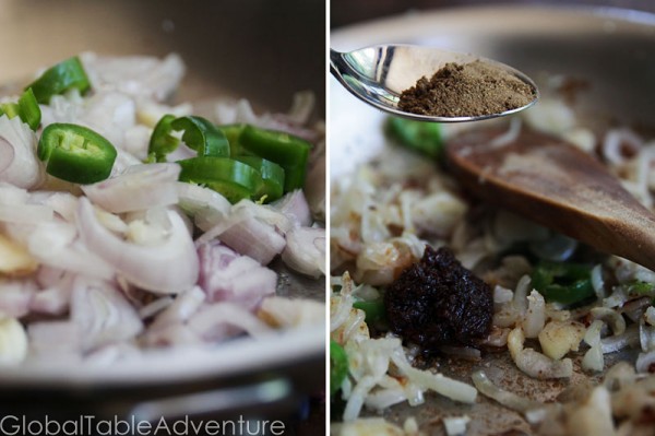 Now, let’s build that mysterious flavor. First, saute the shallots in peanut oil with the garlic and chili pepper until browning and fragrant. I used half a serrano. Once the shallot mixture softens and begins to brown, stir in the ground coriander, candle nut, and shrimp paste, if using it. Cook about 30 seconds, or until the house smells so good you can hardly stand it.