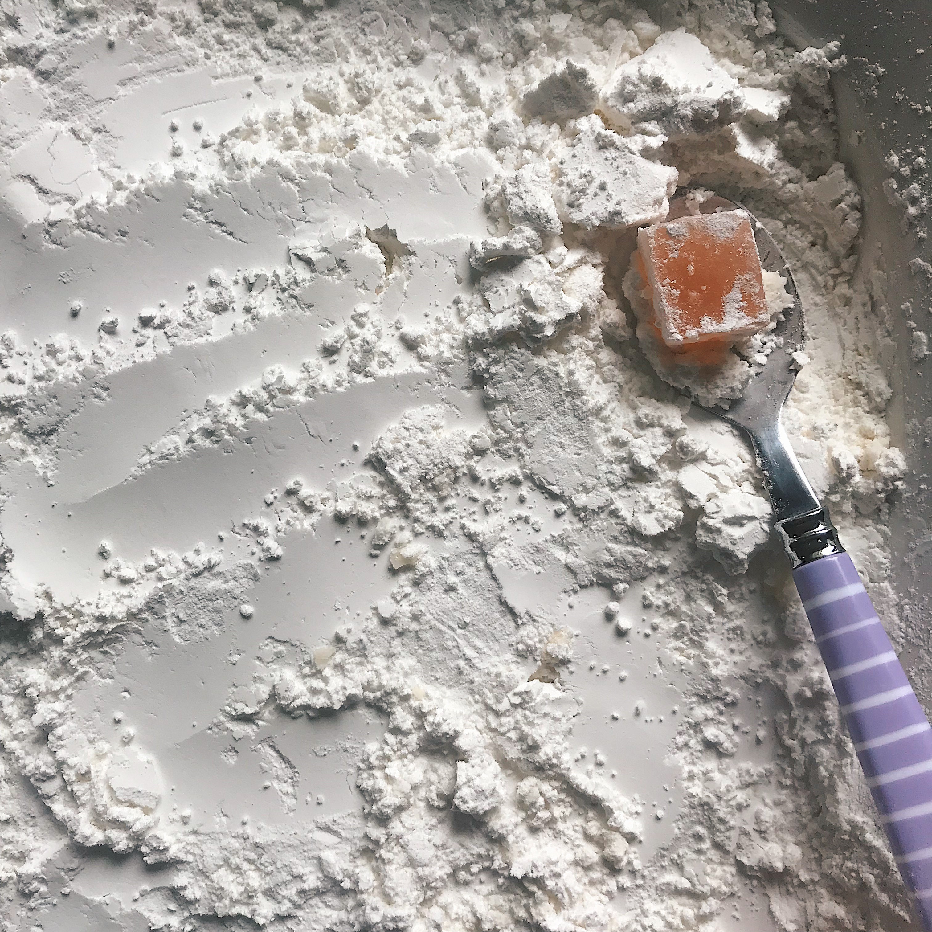 4. Now that the Turkish Delight is buried in the coating, let stand, covered, for 2 days. This critical step develops a crust that keeps the soft, moist interior from sweating outwards. If some candies do start to “emerge” from their sugary bed, just cover them back up. 🙂