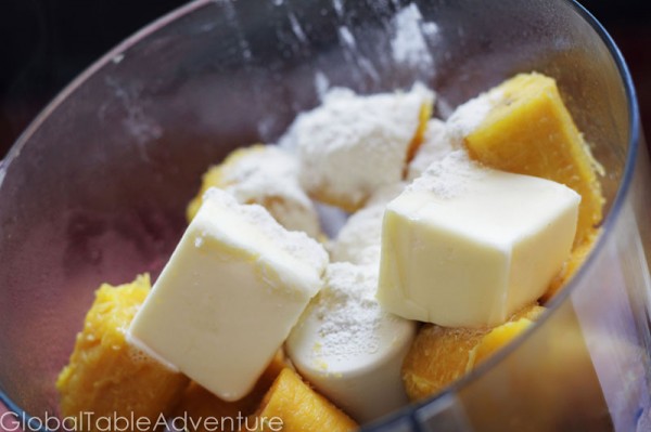 3. When they are cool enough to handle, take the plantains out of their skins. Pulse the plantains in a food processor with cube butter, flour, salt, and pepper. Start with a 1/8 cup. Keep adding flour until a soft dough forms. It should not be sticky or greasy.