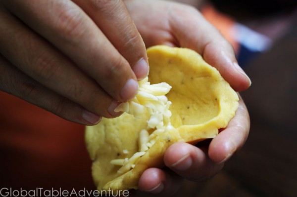 4. Once you have soft, workable dough, pinch off a gold-sized ball portion and flatten into a thin disc. Add a little cheese to the center and fold over. Seal by pressing the seams together.
