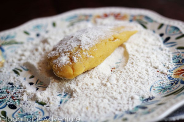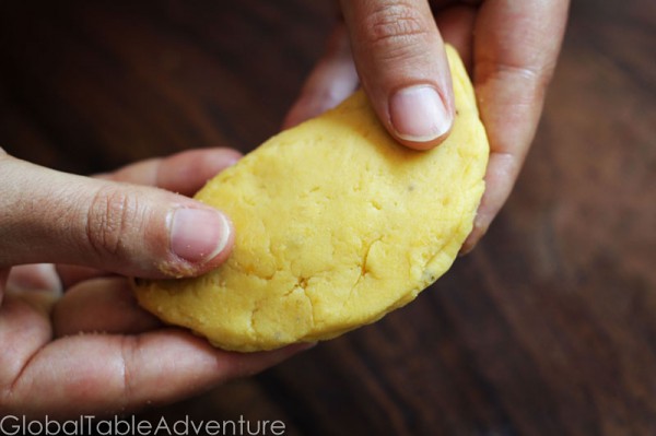 Pulse the plantains in a food processor with cubed butter, flour, salt, and pepper. Start with a 1/8 cup. Keep adding flour until a soft dough forms. It should not be sticky or greasy.