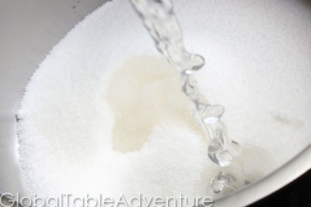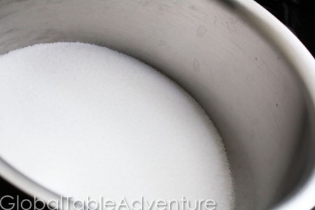 - Add one cup sugar to small saucepan over medium-low heat. Add water and cream of tartar. Cook until light golden brown.