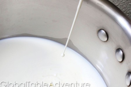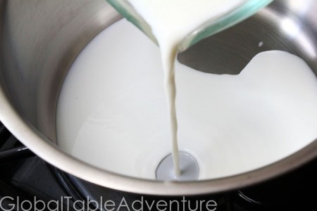 Heat everything over medium until the milk is scalded, or just nearly boils. Then, remove from heat and cool to room temperature.