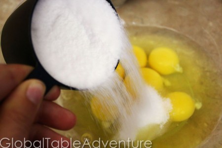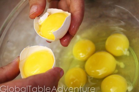 Meanwhile, crack 5 eggs into a large bowl as well as two egg yolks. The two egg yolks take this dessert over the edge in creaminess. Trust me on this. You’ll faint when you eat it. I did.