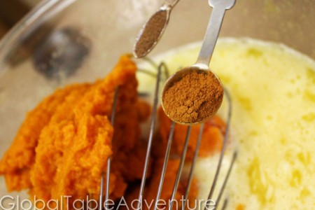 - Meanwhile, crack 5 eggs into a large bowl as well as two egg yolks. The two egg yolks take this dessert over the edge in creaminess. Ad the sugar and pumpkin puree, cinnamon and allspice. Stir together with the cooled cream mixture. Strain.