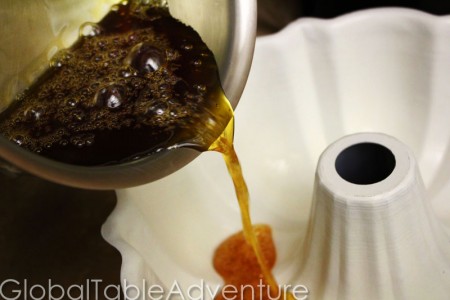 Now, here’s the exciting part. Pour the caramel into your bundt pan while still hot. By the way, your caramel should not be as dark as mine. I let it go too long. Pull it off the heat when light golden brown – perhaps half as dark as my mixture.