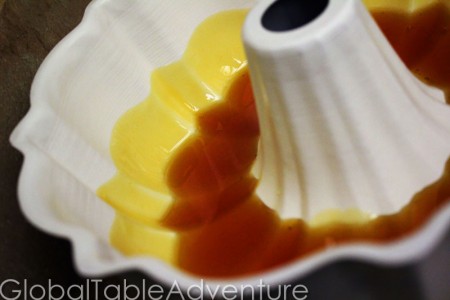 - Pour the light caramel into bundt pan, then add the strained custard.