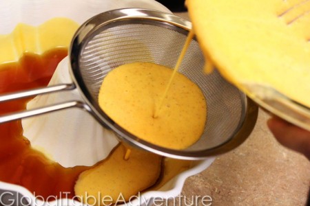 Strain your gorgeous flan mixture into the pan (or, if you find it easier, strain into a bowl first). I just hate making more dishes that I have to.