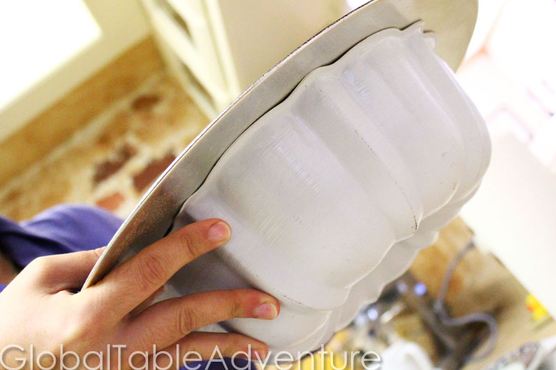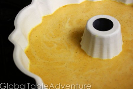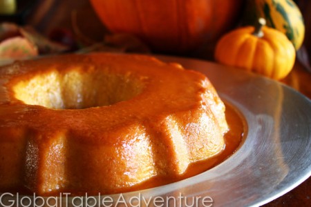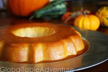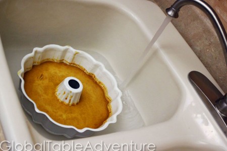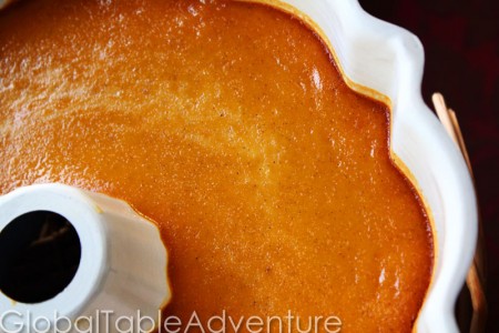 After straining, here’s the filled bundt pan of flan. Can you smell the pumpkin and spices? Perfection!