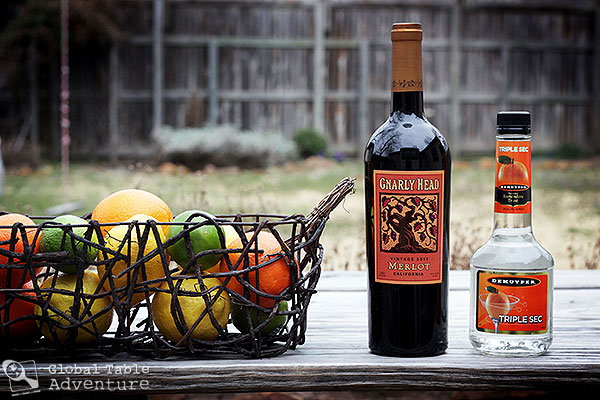 Next, pour the merlot and triple sec into your desired container, such as a wide mouthed pitcher or a pretty, little punch bowl.