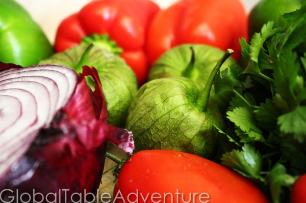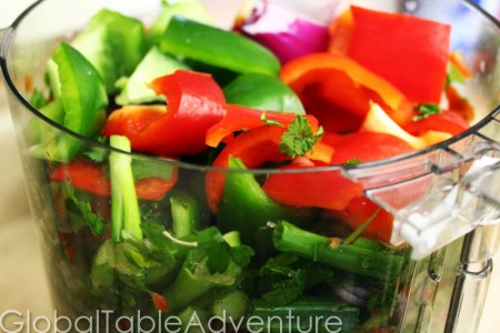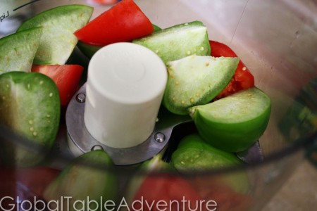 Toss the wettest ones in a large food processor (I have an 11 cup one) and give them a couple of quick pulses. This moistness will help process the rest of the ingredients. I did the tomatoes and tomatillos.