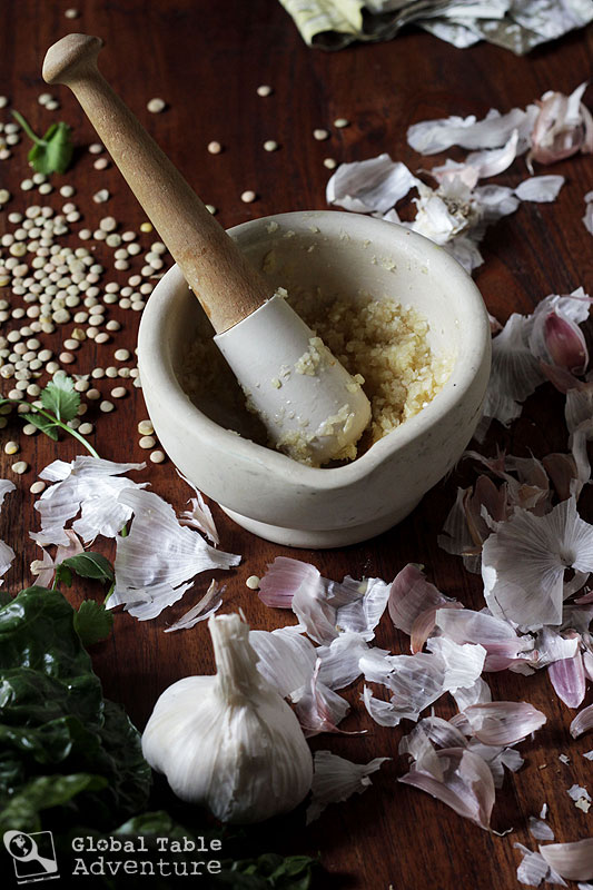 We’ve eaten a whole head of garlic on this Adventure before, as with our Lebanese garlic sauce Toum, but this time our garlic is making friends with lentils and Swiss chard. They bubble and steam up together, considerably mellowing out the flavor.