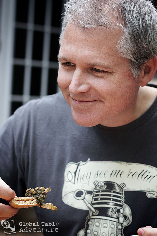 [dropshadowbox align=”none” effect=”lifted-both” width=”575px” height=”” background_color=”#ffffff” border_width=”1″ border_color=”#dddddd” ]TIP: Clifford A. Wright, whose recipe I adapted, says that the flavor is not the same if you don’t pound the garlic in a mortar and pestle. I cut the work in half by crushing it into my mortar and pestle, then banging it out for the rest of the way.[/dropshadowbox]