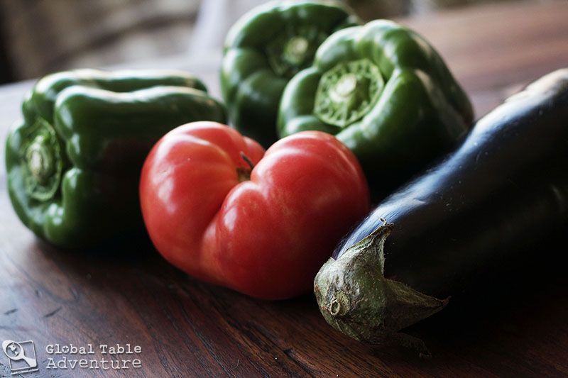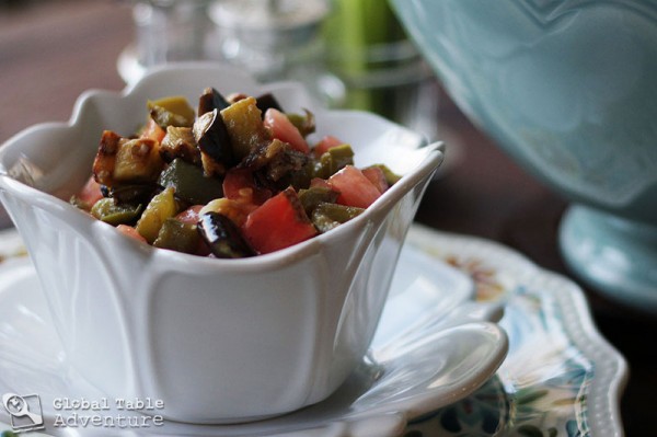 The eggplant and peppers are pre-cut and roasted, which gives good browning and clean edges. Once tossed with fresh tomatoes and a sprinkling of lemon juice, this salad just begs to be eaten with crusty bread and a glass of wine (Macedonia has long produced good wines and CNN even called her the new Napa Valley in 2010).