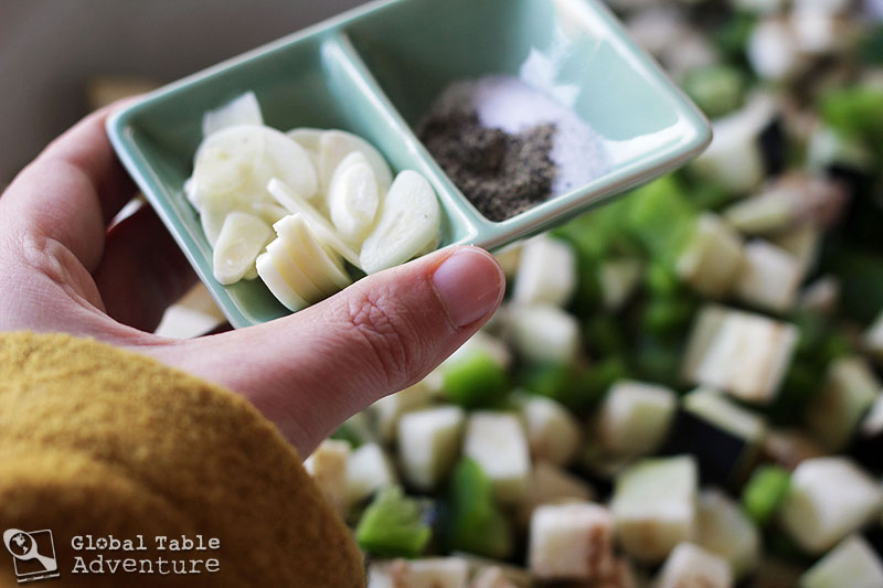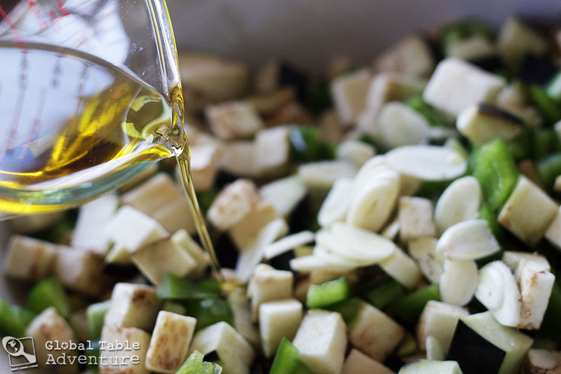 - In a large bowl toss the cubed eggplant and peppers with garlic, salt, pepper, and olive oil. Add a dash of oregano, if desired.