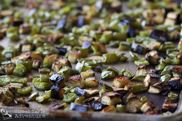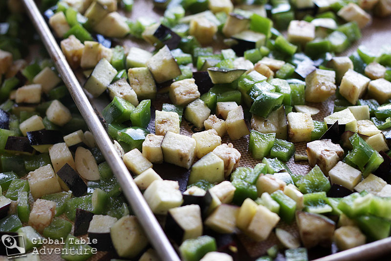 When you get home, preheat the oven to 450F. Meanwhile, toss the cubed eggplant and peppers with garlic, salt, pepper, and olive oil. Add a dash of oregano, if desired.
