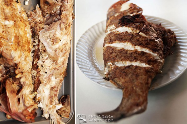 Keep in mind, you have two choices when it comes to roasting the fish – over the grill or in the oven. Just be forewarned – if you grill it, the skin can easily stick to the grill and you risk losing your beautiful, flavorful crust. I know, because I did it. They say the key to grilling fish is to put the fish on an extremely hot, oiled grill, reduce the temperature, and flip only once. None of this helped me and, while the fish was tasty, all the flavor stayed behind on the grill.