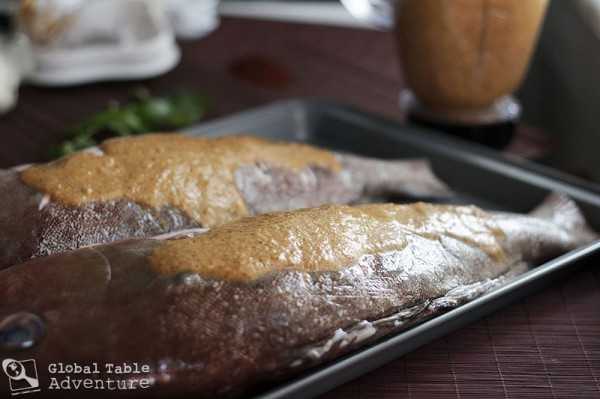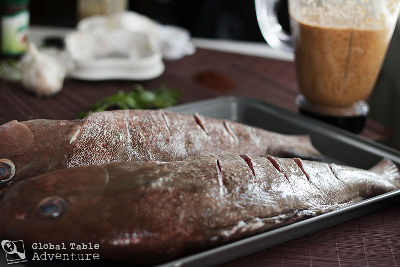 - Spread the marinade all around, on both sides. I only used half the marinade on these two giant fish.