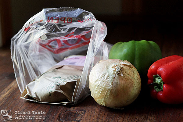 - Cube the meat, peppers, and onion.