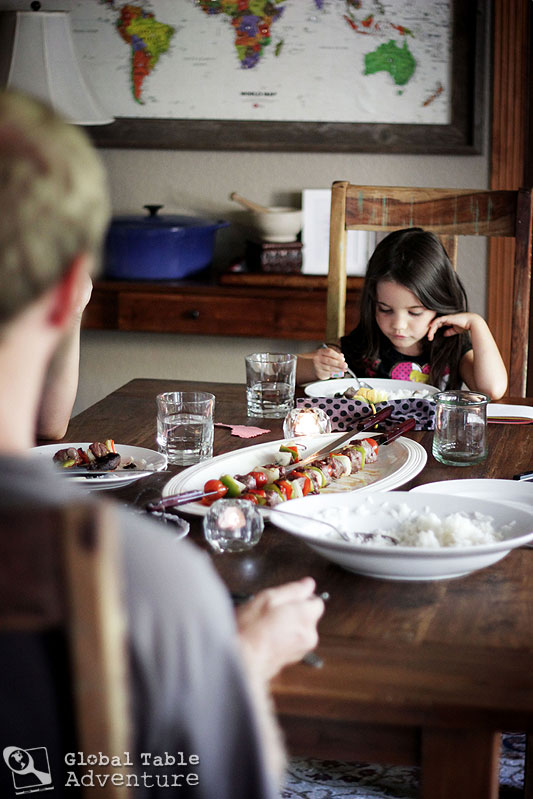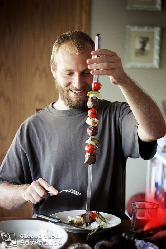 (I taught him how to press the skewer into his plate to steady it while he uses his fork to slide off what he wants onto his plate).